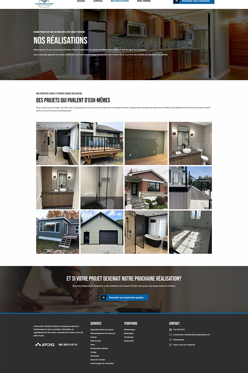 Construction Christian Charron est un entrepreneur général établi à Charlemagne et actif partout dans Lanaudière, spécialisé en agrandissement de maison ainsi qu’en rénovation de cuisines, sous-sols, patios et plus. Pour cette entreprise, nous avons conçu et développé un site web vitrine moderne et adaptatif, mettant de l’avant leurs services, leurs réalisations et leurs forces locales. L’architecture du site a été pensée pour faciliter les demandes de soumission et inspirer confiance, grâce à une navigation simple, des visuels soignés et des appels à l’action clairs.