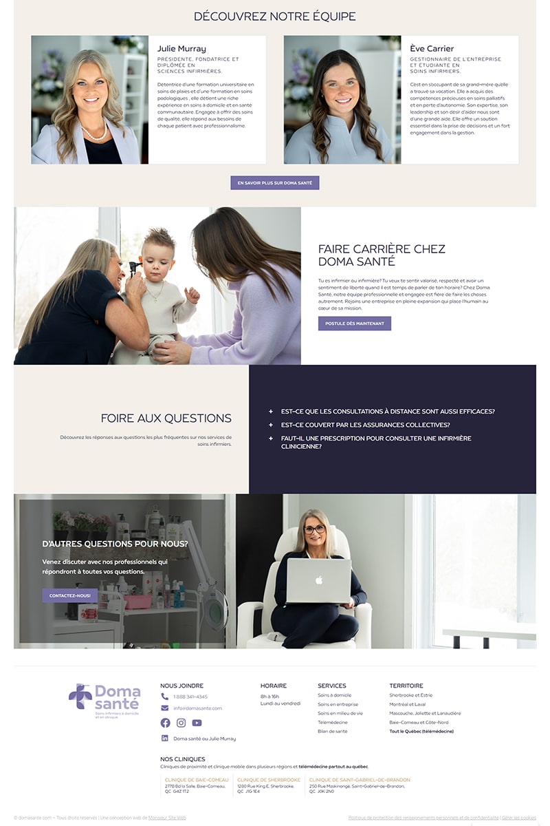 Nous avons conçu le site web de Doma Santé avec l’objectif de refléter les valeurs humaines et professionnelles au cœur de l’entreprise fondée par Julie Murray. L’interface épurée et chaleureuse met en avant la qualité des services offerts en soins infirmiers, tout en facilitant la prise de contact et la navigation pour les patients. L’identité visuelle, inspirée par la douceur et la confiance, traduit l’expertise et l’empathie qui caractérisent Doma Santé. Le résultat : un site à la fois informatif, accessible et à l’image de la bienveillance de l’équipe.