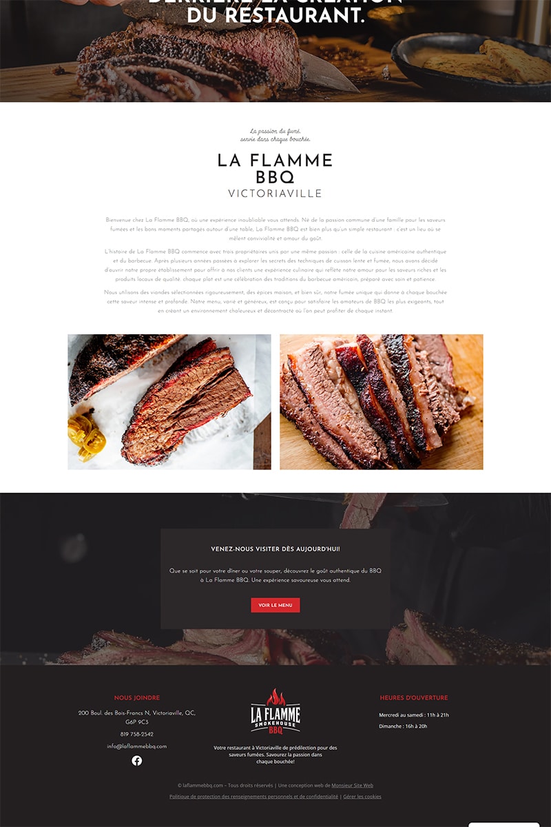 Le restaurant La Flamme BBQ est un établissement unique à Victoriaville, né d’une véritable passion pour la cuisine fumée, authentique et généreuse. Notre mission était de concevoir un site web à l’image de cette passion : chaleureux, audacieux et appétissant. Nous avons misé sur une identité visuelle forte, une présentation claire du menu et une expérience utilisateur fluide, afin de refléter l’ambiance conviviale et la qualité des plats. Le résultat : un site web qui met en valeur le savoir-faire artisanal du restaurant et donne envie de goûter à l’expérience La Flamme BBQ.