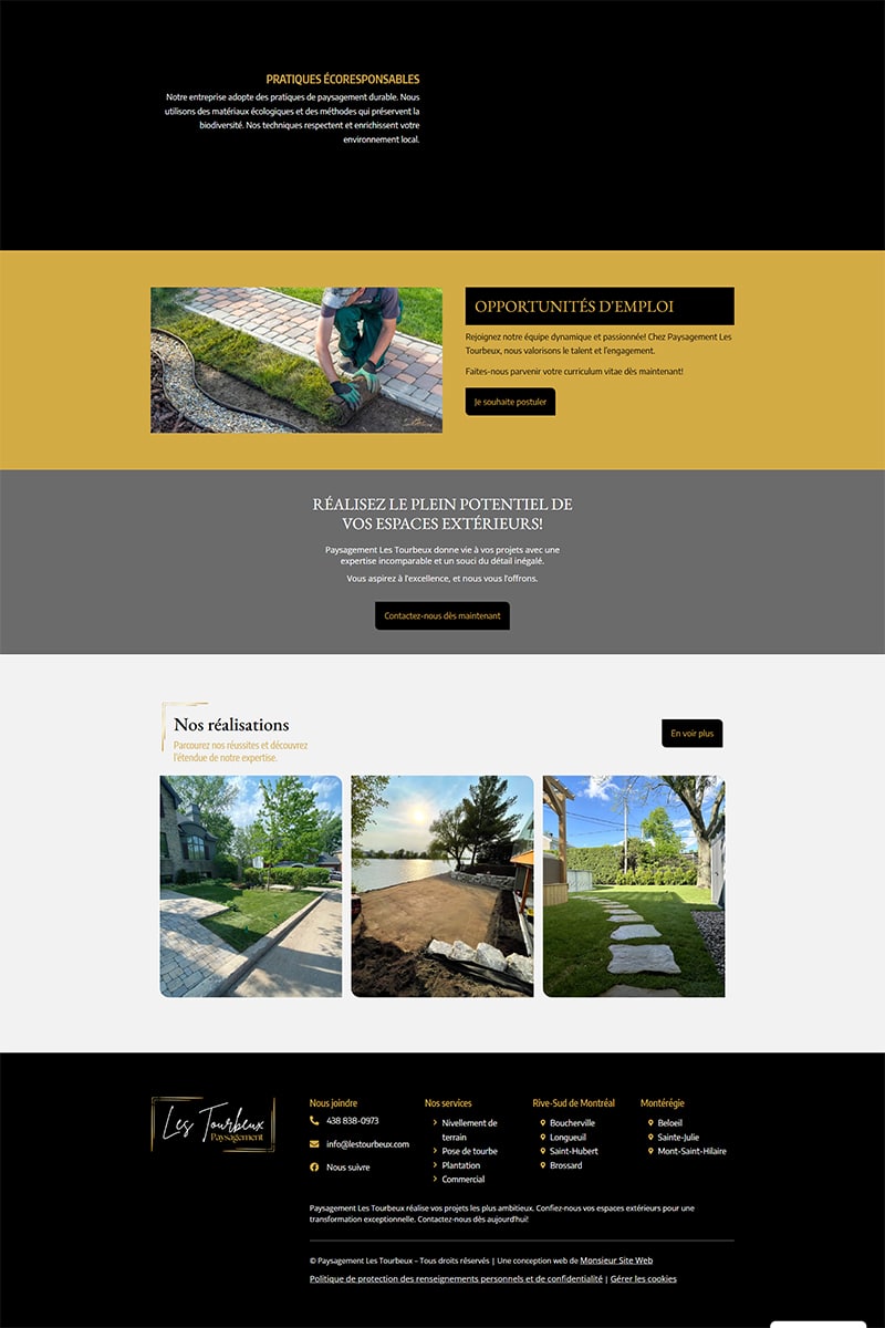 Nous avons conçu le site de Paysagement Les Tourbeux, experts en terrassement, nivellement de terrain, pose de tourbe et plantation partout sur la Rive-Sud. L’objectif principal : élever la crédibilité de l’entreprise avec une présence en ligne propre, nette et professionnelle. L’expérience débute avec une vidéo dans l’entête pour immerger immédiatement le visiteur dans la qualité du travail réalisé. La structure du contenu a été pensée pour mettre en valeur les services, rassurer par des preuves visuelles et faciliter la prise de contact. Résultat : un site qui reflète le sérieux de l’entreprise et soutient la conversion des prospects.