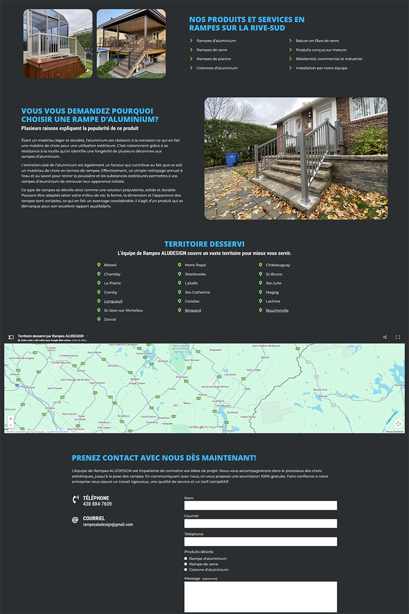 Avec Rampes Alu-Design, l’objectif était de concevoir un site web moderne, professionnel et à l’image de la qualité des produits. L’entreprise se distingue par son expertise dans la fabrication de rampes d’aluminium durables, sécuritaires et esthétiques, et il était essentiel que cette excellence se reflète à travers sa présence en ligne. Nous avons donc créé une plateforme élégante et fonctionnelle, mettant en valeur les produits, les réalisations et le savoir-faire de l’équipe, tout en optimisant l’expérience utilisateur et la performance sur tous les appareils. Par la suite, une campagne numérique cohérente a été déployée afin de renforcer la visibilité du site et attirer de nouveaux clients. Résultat : une vitrine web solide, performante et fidèle à l’identité d’Alu-Design.